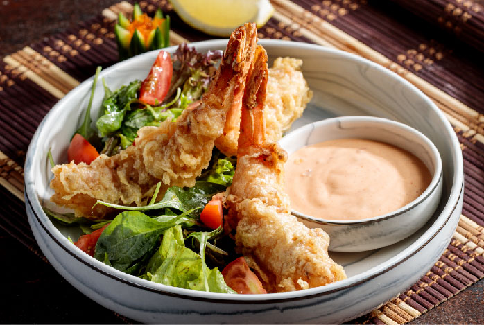 Marinated shrimp with salt, pepper, paprika and garlic. Deep fried served with mixed leaves salad and cherry tomatoes spicy mayo on side.