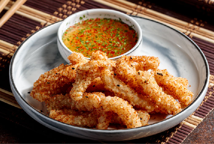 Deep fried crumb squids with sea salt and togarashi powder. Served with spicy chili coriander vinegar.