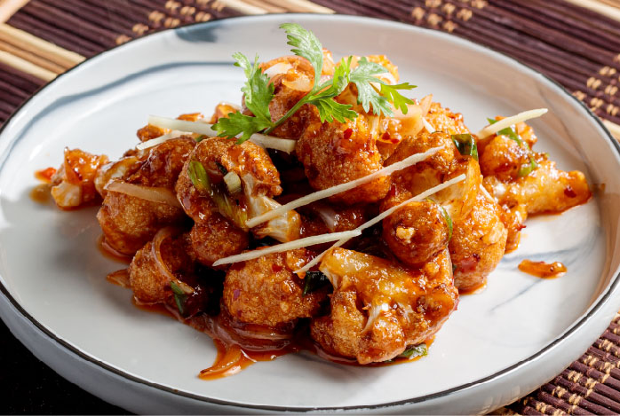 Fried cauliflower, spring onion, red onion, mixed with firecracker sauce. Garnished with sliced ginger and coriander.