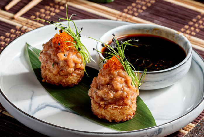 Seasoned sushi fried rice patty, topped with mixture of raw salmon and caviar in Japanese tartare sauce, topped with caviar and rock chives. Served on a bed of sasa noho leaf, with scallion ponzu dip. (Available in Avenues only.)