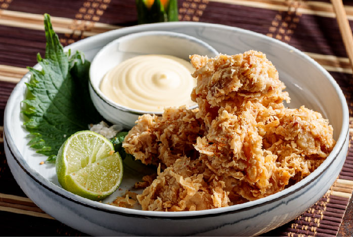 Chicken breast cubes, marinated with yamasa soy sauce, sake, ginger juice, and chopped garlic. Crumbed with all purpose flour, baking powder, salt and pepper. Served with togarashi and Kewpie mayo, garnished with shiso leaf, sea salt & lime.