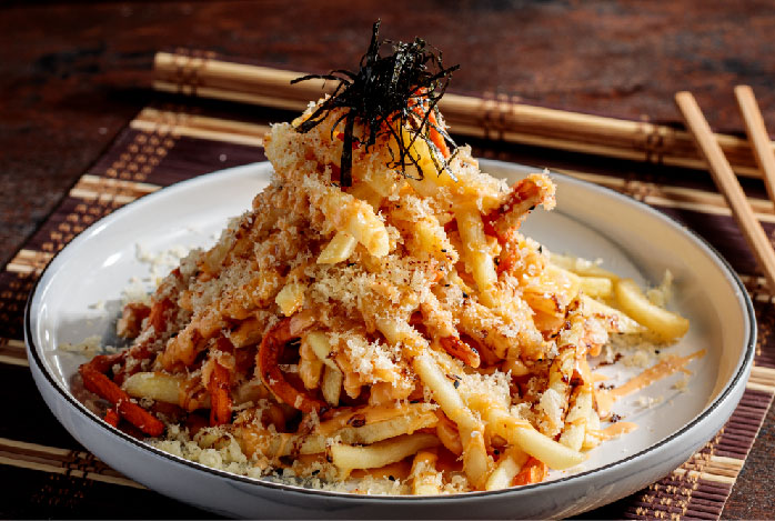Sweet potato and shoestring fries, topped with sweet chili sriracha mayo & on top unagi glaze. Garnish with crispy fried tempura, and togarashi powder and nori sheet.