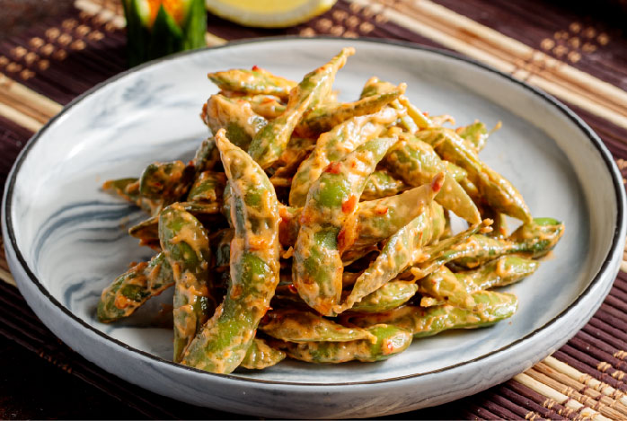 Boiled edamame beans with choices of flavors from plain, salted or spicy.
