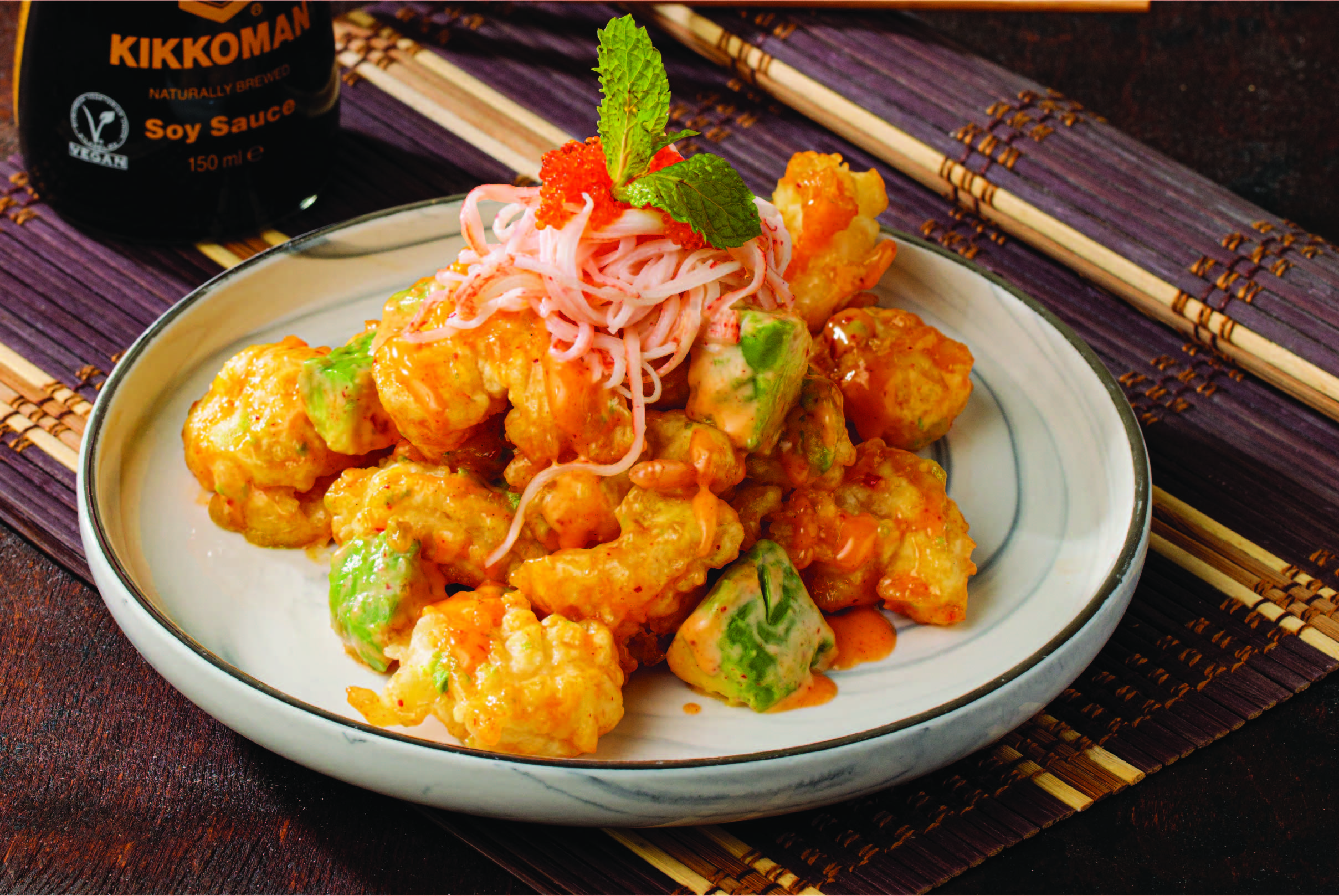 Shrimp, fried with tempura batter, mixed with avocado and dynamite sauce. Topped with shredded crab stick and tobiko. Garnished with mint leaves.