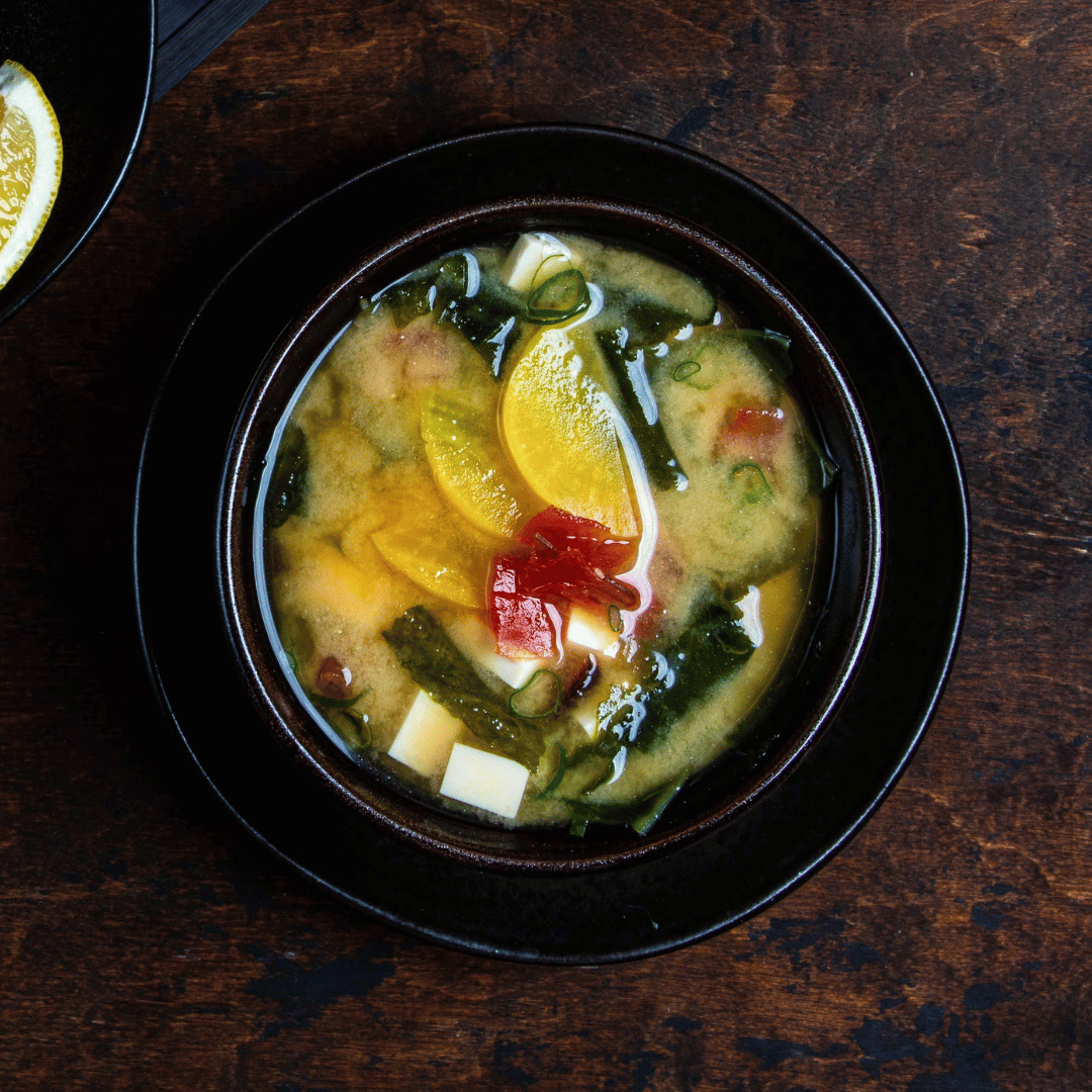 معجون ميسو ، مكعبات توفو ، هونداشي، بصل أخضر، واكامي ، يقدم مع باريكو وتاكوان