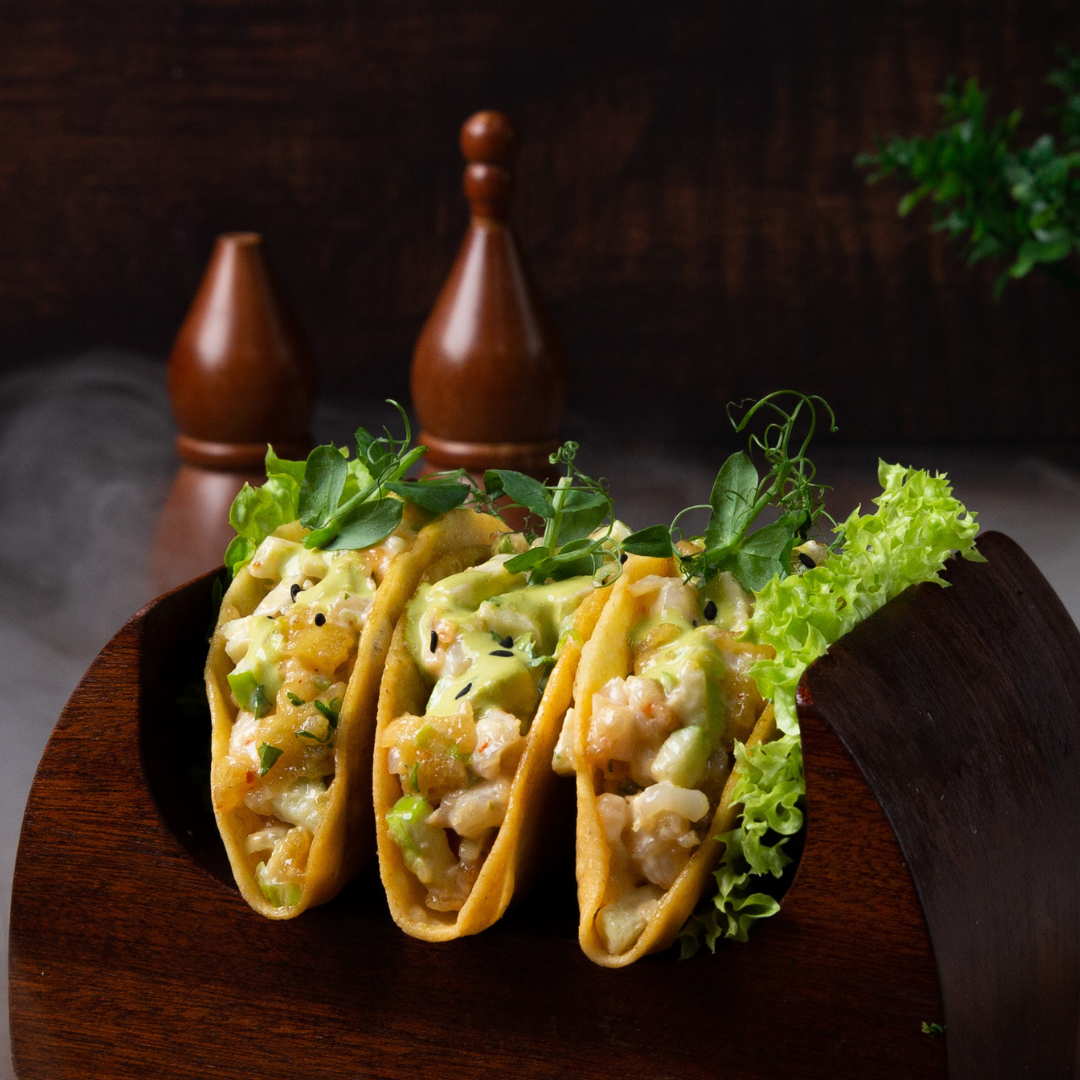 تاكو مقرمش محلي الصنع، محشو تمبورا روبيان ، خس آيسبرج وتفاح أخضر. يخلط بالتساوي مع الصوص الخاص ويزين بالكزبرة.