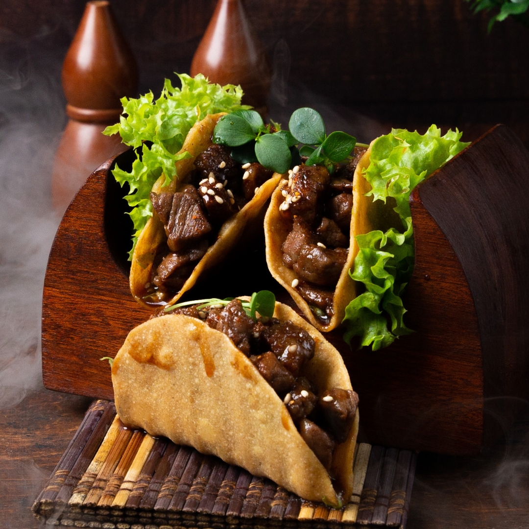 تاكو مقرمش محلي الصنع، محشو بلحم واغيو ترياكي مشوي، ومتبل بصوص ترياكي خاص. مزين بالتوجاراشي ونبات أفيلا كريس