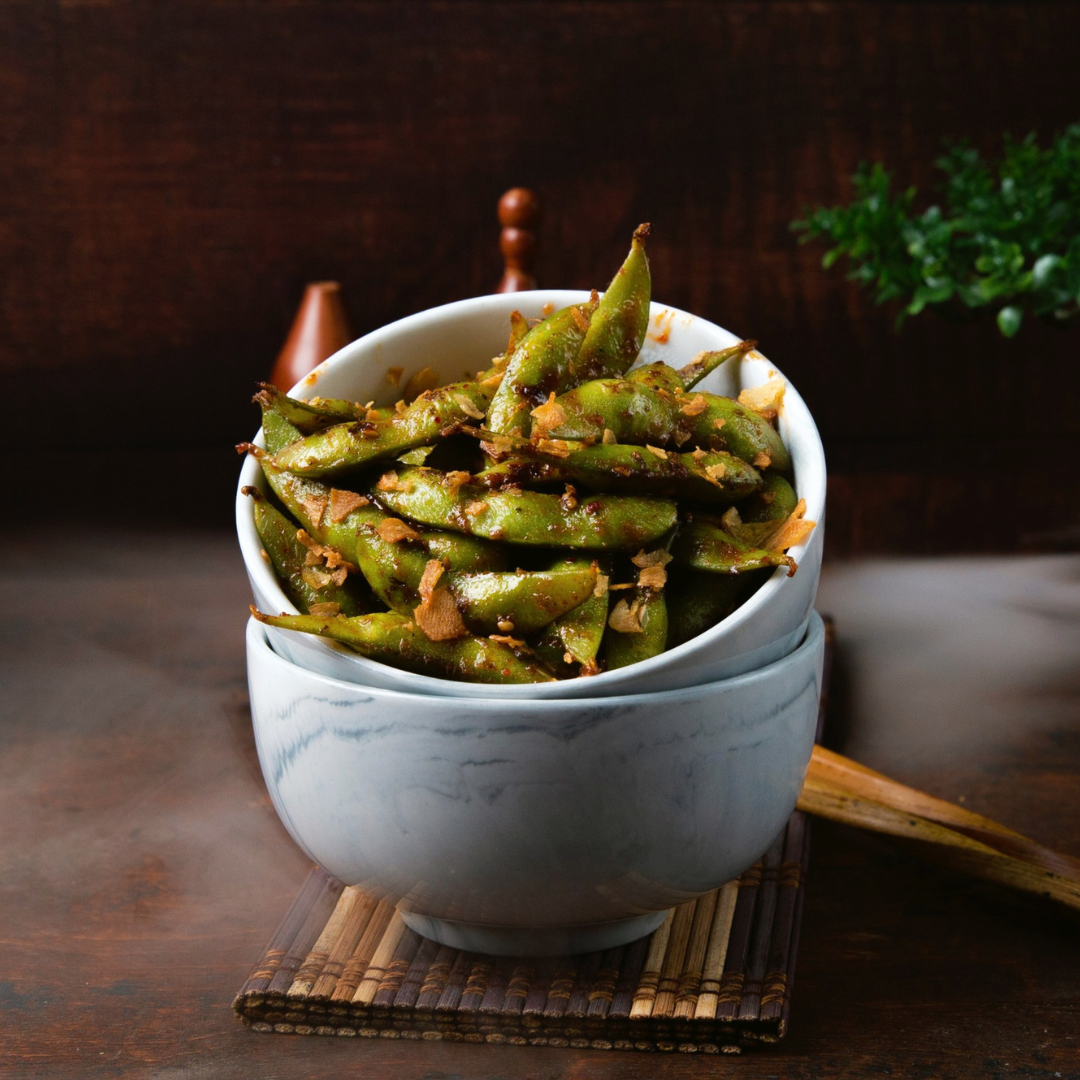 Boiled edamame, seasoned with fried garlic, olive oil, kimchi sauce and zaatar.