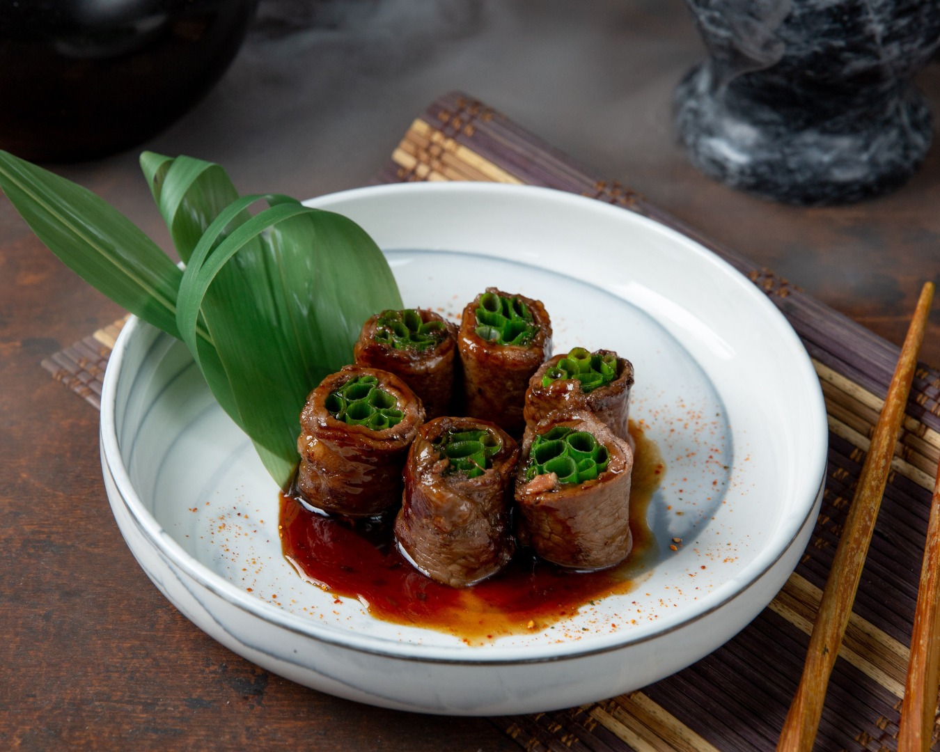 Rolls of Beef Striploin & Spring Onion served with Teriyaki Sauce and sprinkled of Tongrashi.