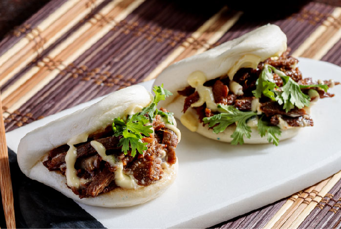 Korean shortrib grilled with pickled onion and drizzled with Korean BBQ sauce. Stuffed in hirata bun and garnished with mayonnaise and coriander.