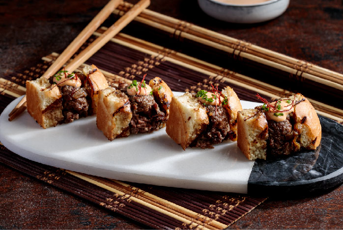 لحم واجيو مشوي مع مشروم، بصل أبيض وجبنة بروفولوني محشو في خبز هيراتا ومغطى بصوص الكمأة أيولي. مزين بنبات أفيلا كريس