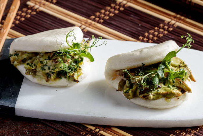 Grilled chicken with miso marinade, pickled onion, mixed with Peruvian sauce and stuffed in hirata bun. Drizzled with Peruvian sauce and garnished with parsley and affilla cress.