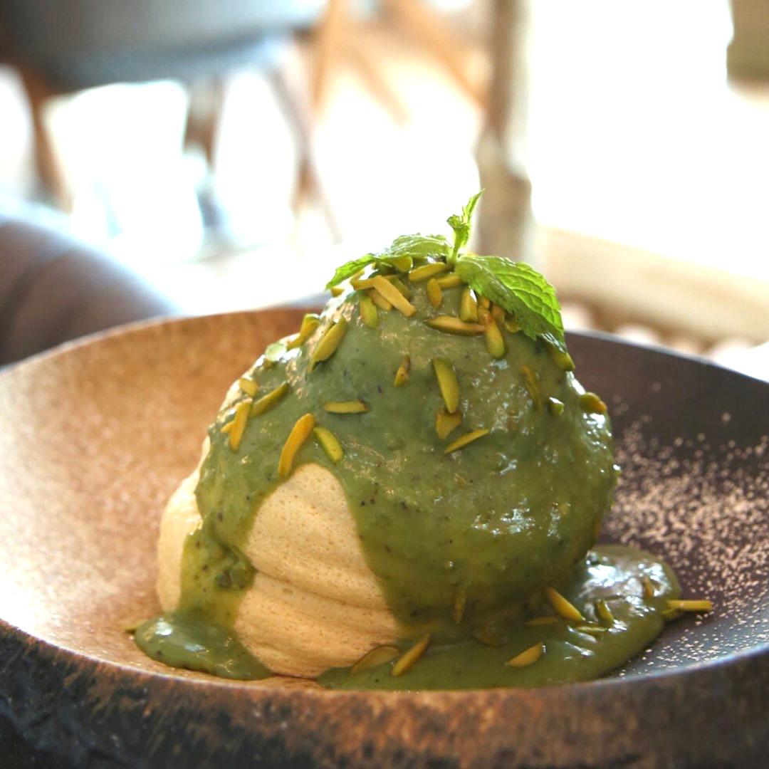 Homemade fluffy sensation served with special pistachio sauce and garnished with pistachio nuts.
