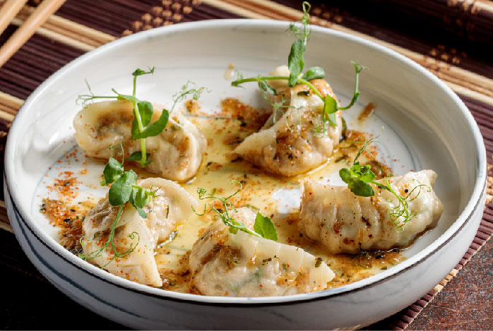 ورقة جيوزا صفراء، محشوة بالدجاج المفروم، صوص الخل الحارة، زبدة شيسو، مسحوق توجاراشي، ومزينة بنبات افيلا كريس. على الجانب بونزو الفلفل الحار