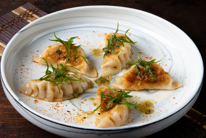 Yellow gyoza sheet, stuffed with minced chicken, spicy vinegar sauce, shiso butter, togarashi powder and garnished with affilla cress. On side scallion chili ponzu.