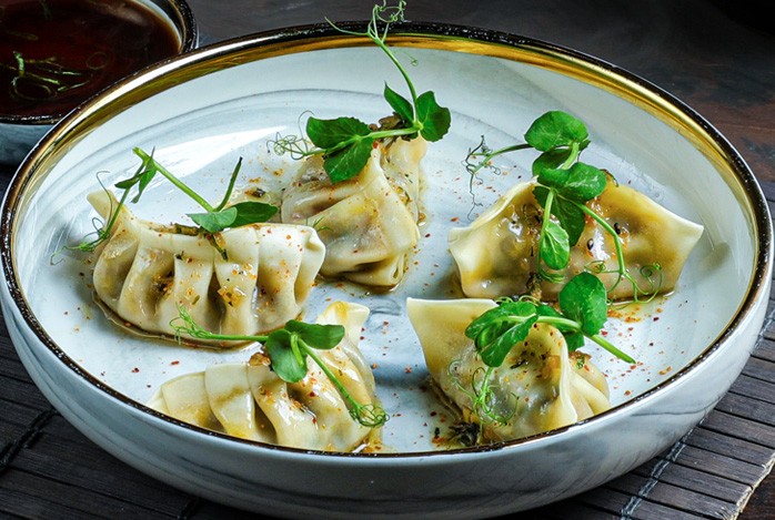 Five tasty steamed dumplings, filled with vegetables. Served grilled and with a dipping sauce.