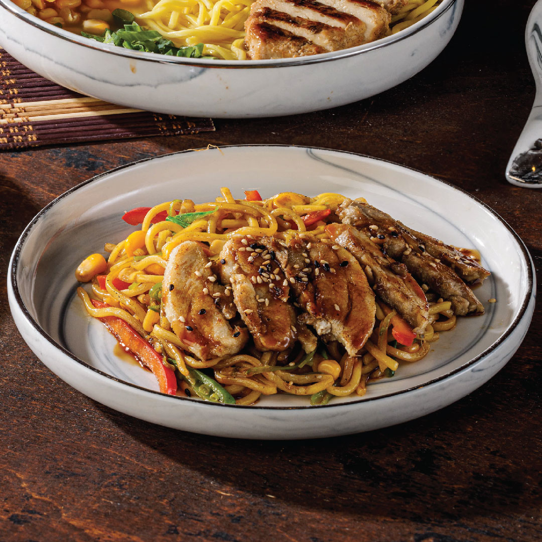 A popular Japanese stir fry noodles with seasonal vegetables topped with ginger chicken tossed with teriyaki sauce.