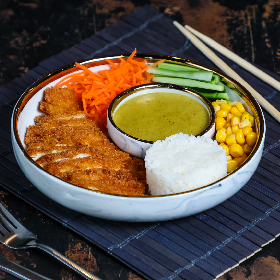 Fried chicken breast made with Panko breadcrumbs and served with variety of vegetable and katsu curry sauce.