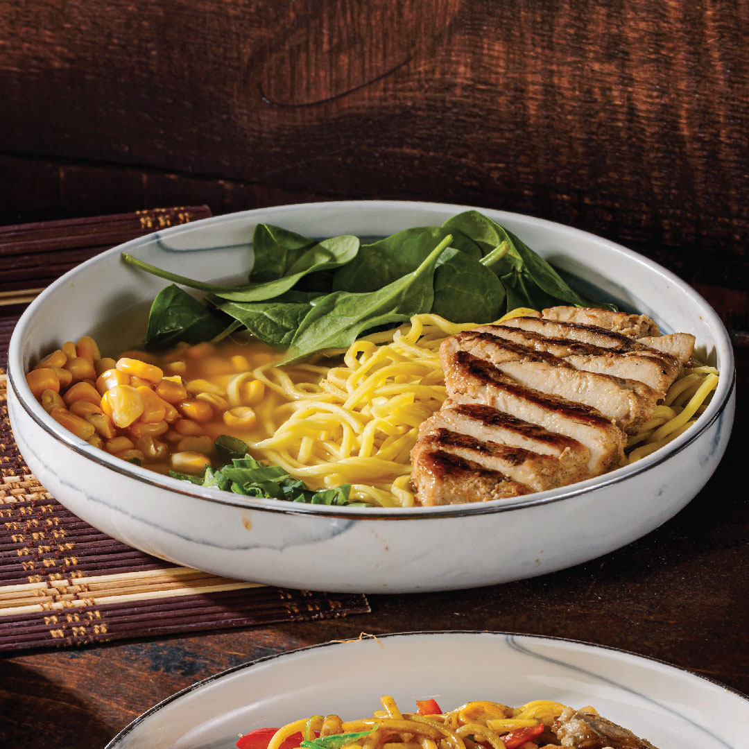 Soba noodles in a chicken soup stock, topped with fresh vegetables and grilled chicken breast.