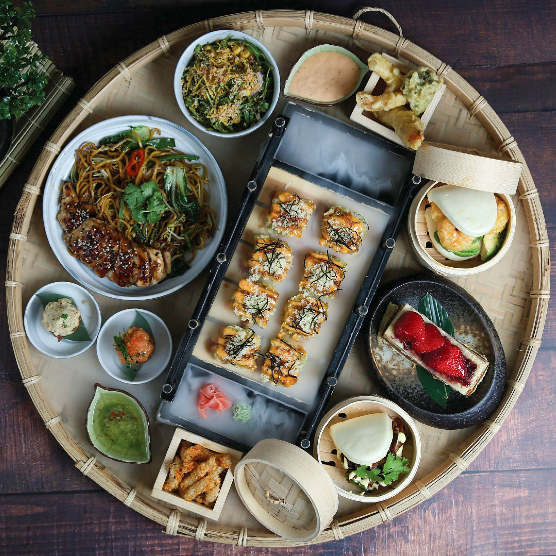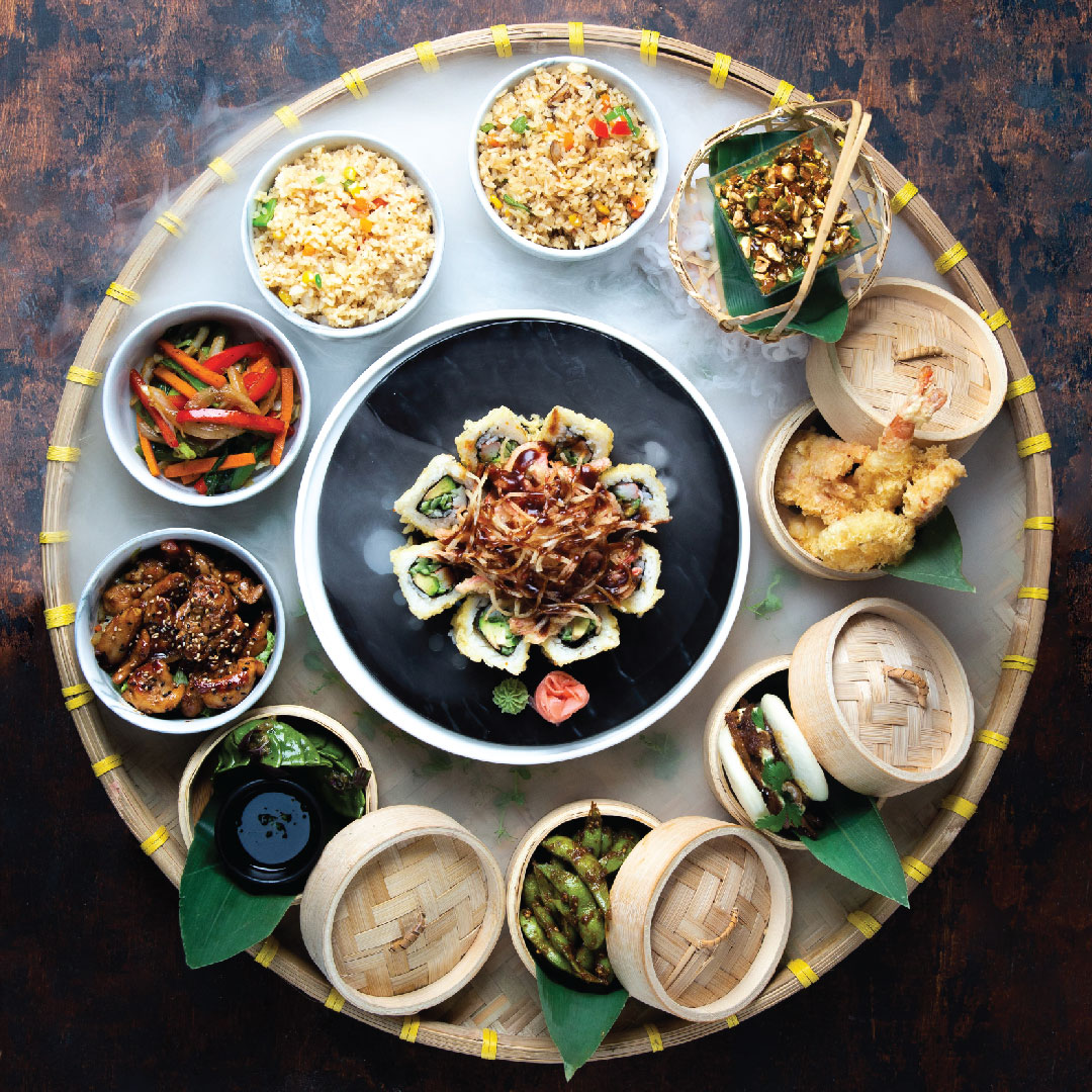 Festive platter that includes: Crispy Maki, Mushroom Gyoza, Zaatar Edamame, Bao Bun, Mixed Tempura, Chicken Teppanyaki, Yasai, Fried Rice and Dessert.