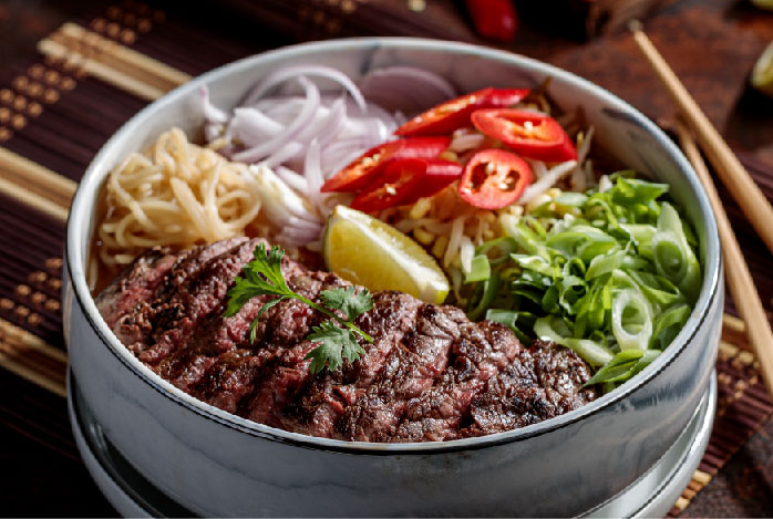 نودلز رامين في قاعدة مرق دجاج، صوص رامين لحم بقري، شريحة لحم بقري مشوية، براعم فاصوليا نباتية، بصل أحمر، بصل أخضر، كزبرة، شرائح فلفل أحمر حار، وشرائح ليمون