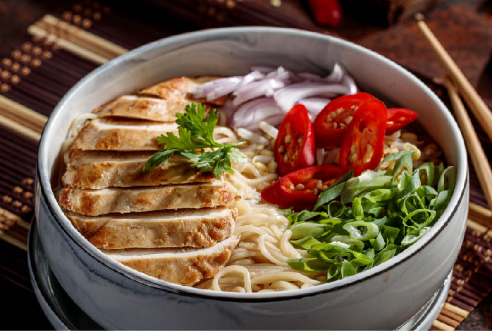 نودلز رامين في قاعدة مرق الدجاج، صوص رامين دجاج، دجاج رامين مشوي، براعم .فاصوليا نباتية، بصل أحمر، بصل أخضر، كزبرة، شرائح فلفل أحمر وشرائح ليمون