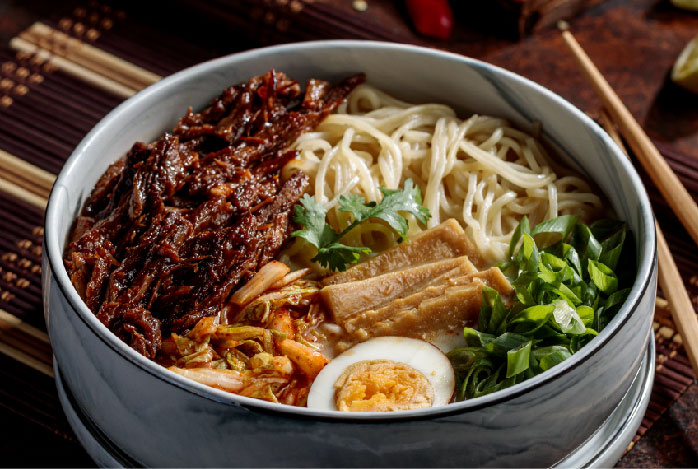 نودلز رامين، مرق دجاج، لحم بريسكيت، نصف بيضة مسلوقة، كيمتشي، بصل أخضر، كزبرة، براعم البامبو، زيت فلفل حار وصوص باربيكيو كوري.