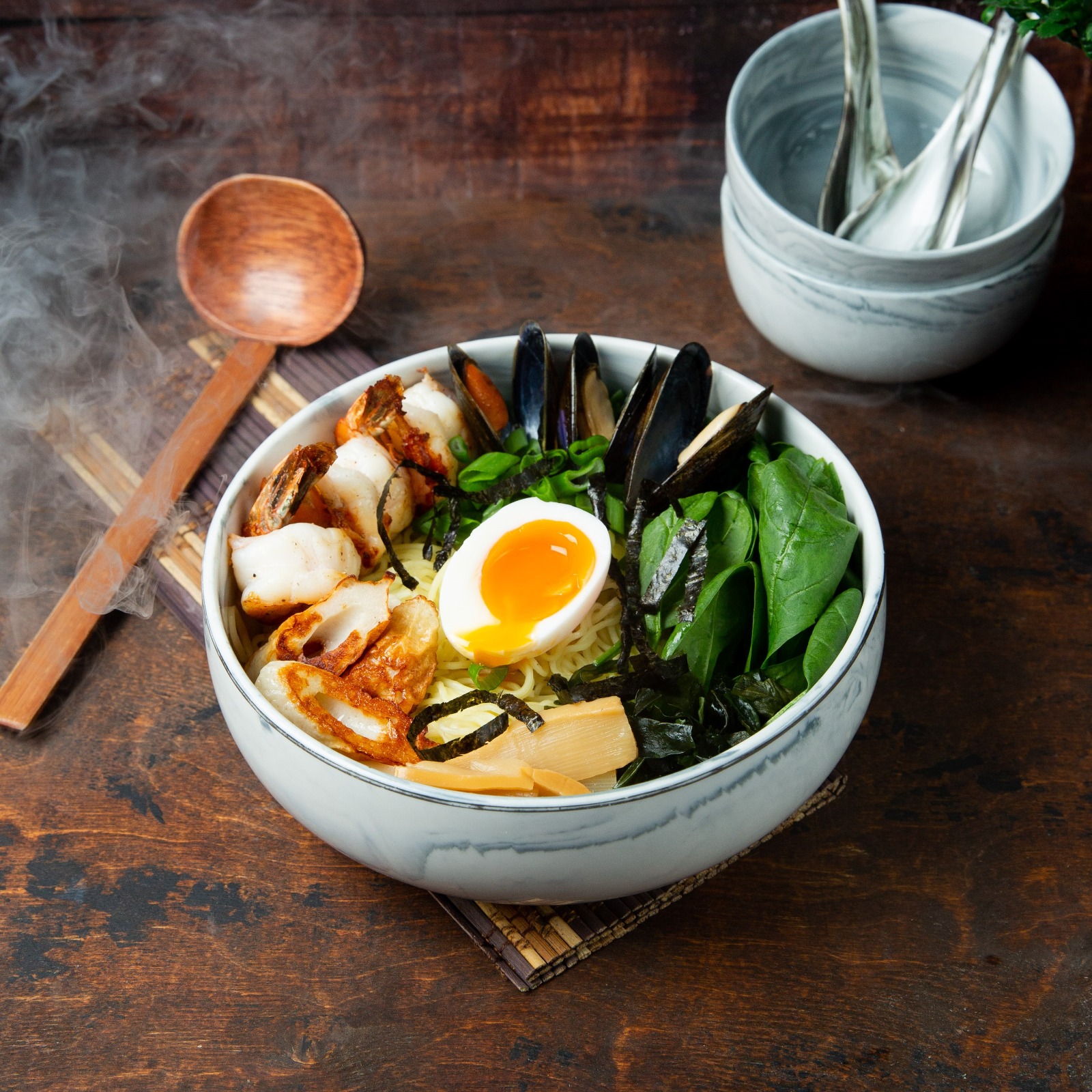 Stock based seafood ramen noodles, served withy mussels, prawns, chikuwa, baby spinach, wakame seaweed, spring onion and half boiled egg. Garnished with nori.