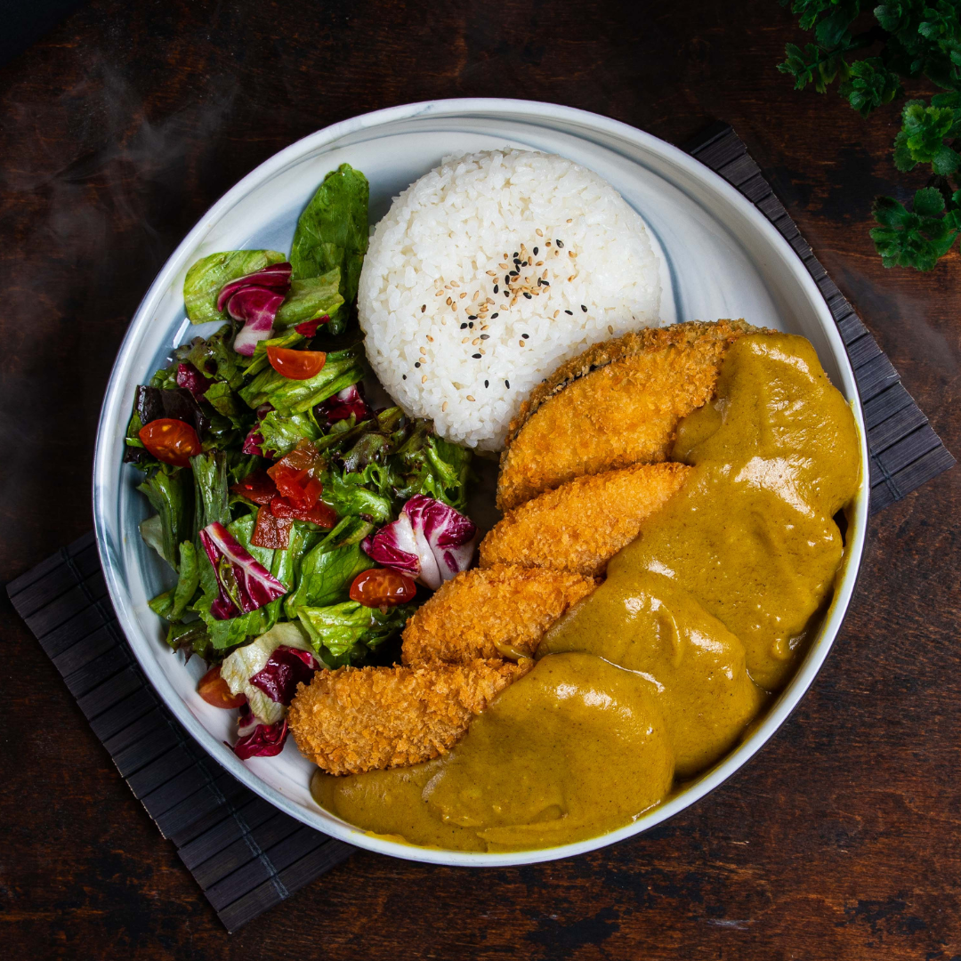 This features a generous portion of crispy, breadcrumb-coated vegetables. These golden delights are the heart of the dish, accompanied by a lusciously thick and aromatic curry sauce redolent with a blend of exotic spices. It's a comforting embrace of crunch and spice, complemented by a side of fragrant rice and salad.