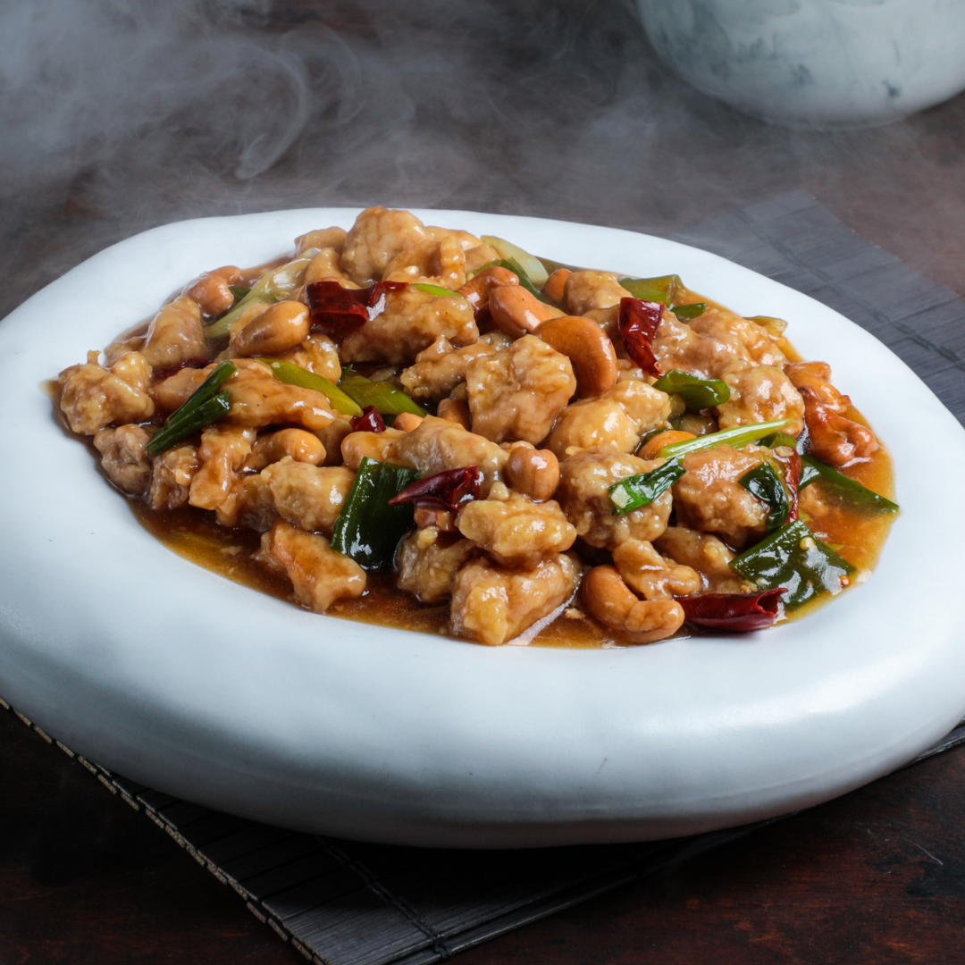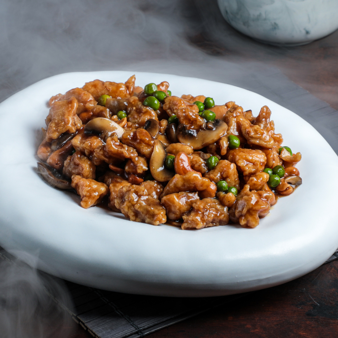 يتميز هذا الطبق بمزيج شهي من قطع أفخاذ الدجاج المتبلة والمقلية في زيت دوار الشمس حتى تصبح ذهبية اللون، والكاجو والخضروات الطازجة، جميعها مغموسة في صوص لذيذ مصنوع من صوص المحار وصوص الصويا الخفيف.