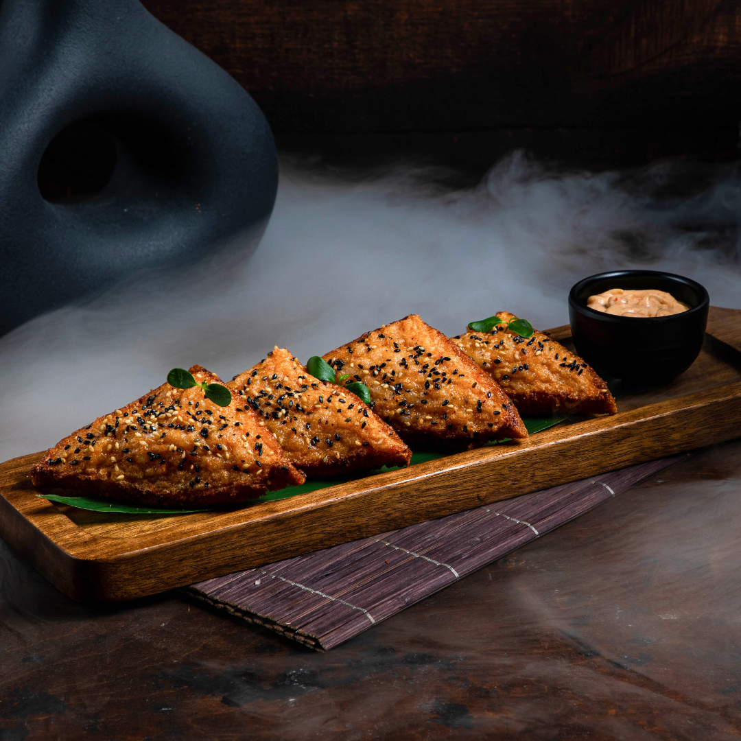 تذوق القرمشة اللذيذة لتوست الجمبري، وهو مزيج من الروبيان الممزوج بدقة كيما وبذور السمسم فوق شريحة خبز ذهبية مقرمشة، كلها مقلية في زيت نباتي فاخر. مصحوبة بصوص ابيض حارة ومزينة بأوراق الساكورا