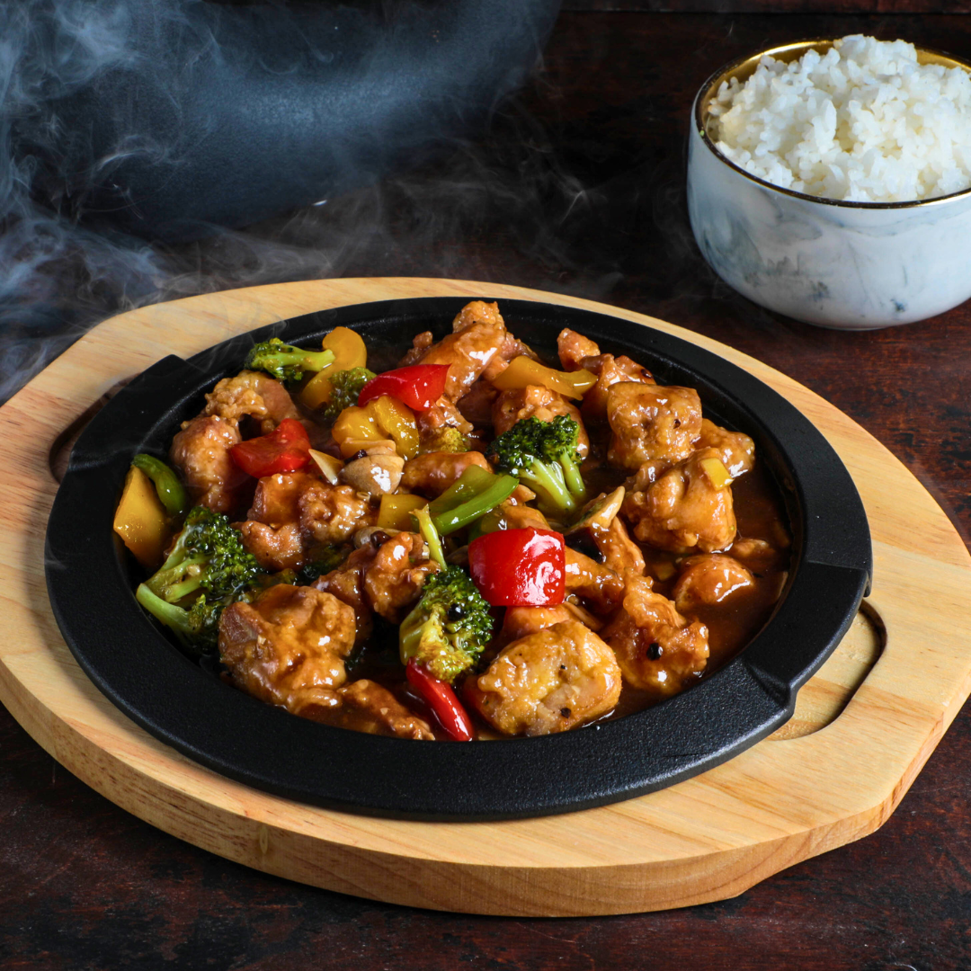 A delightful dish that balances the tangy zest of our signature sweet and sour sauce with the succulent tenderness of marinated chicken thighs. These juicy chicken pieces are lightly fried in sunflower oil and combined with a selection of crisp vegetables, all enveloped in a rich, vibrant sauce that tantalizes your taste buds. Served alongside perfectly steamed sticky rice.
