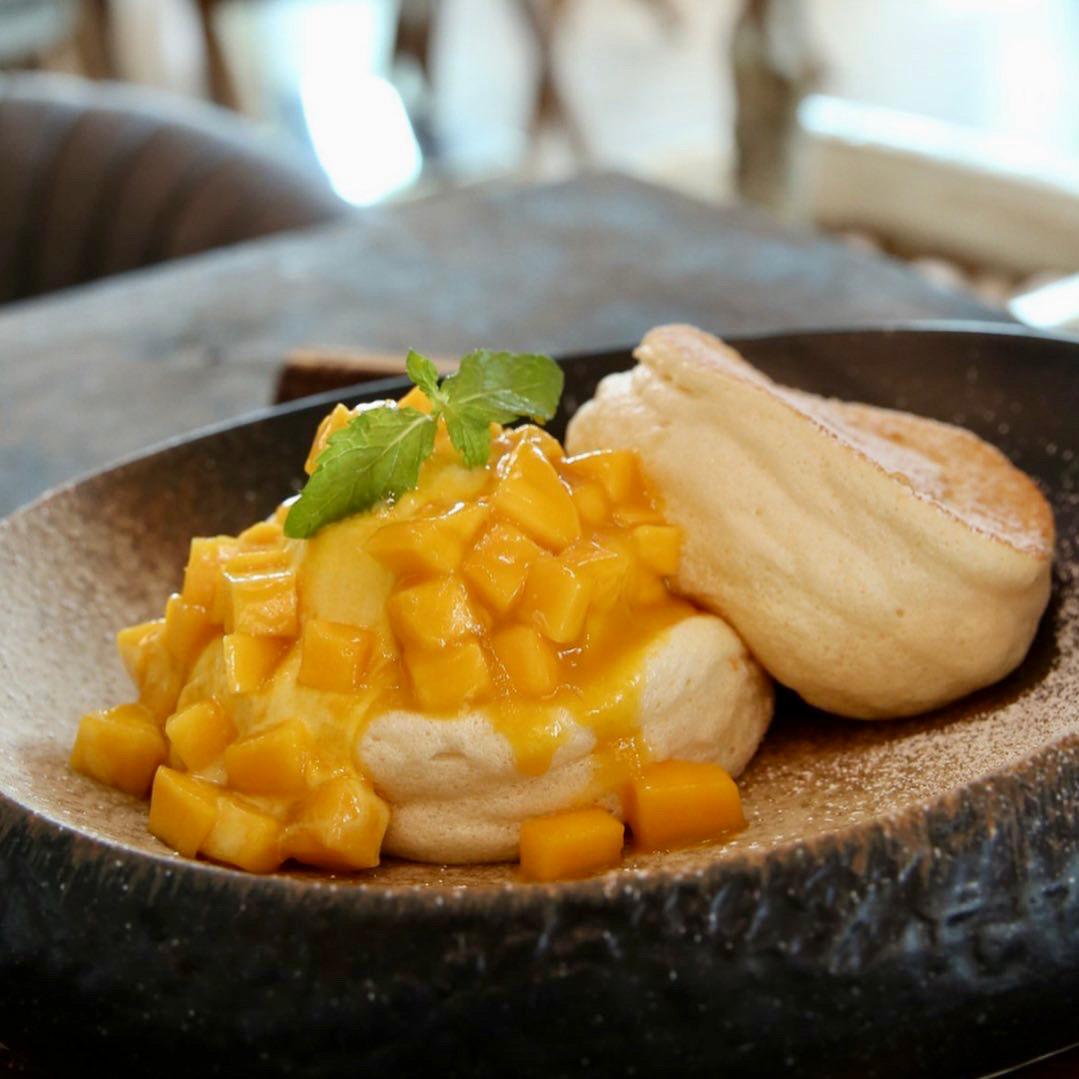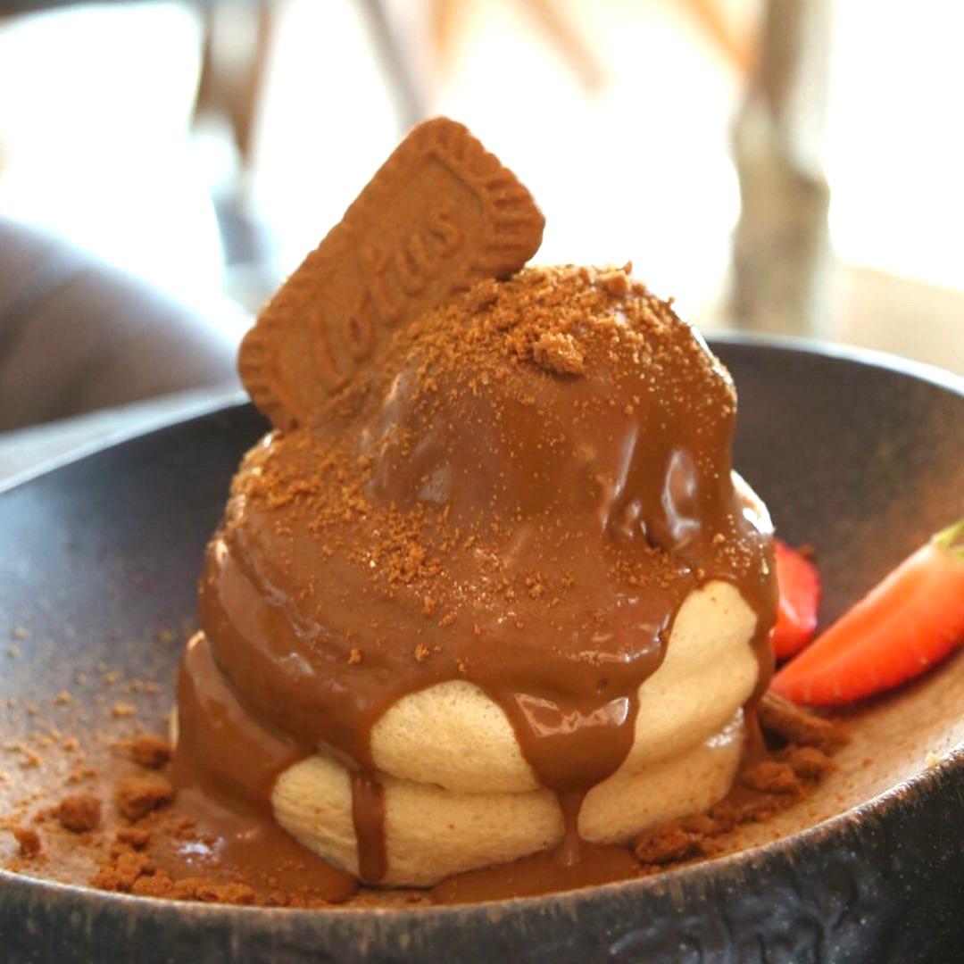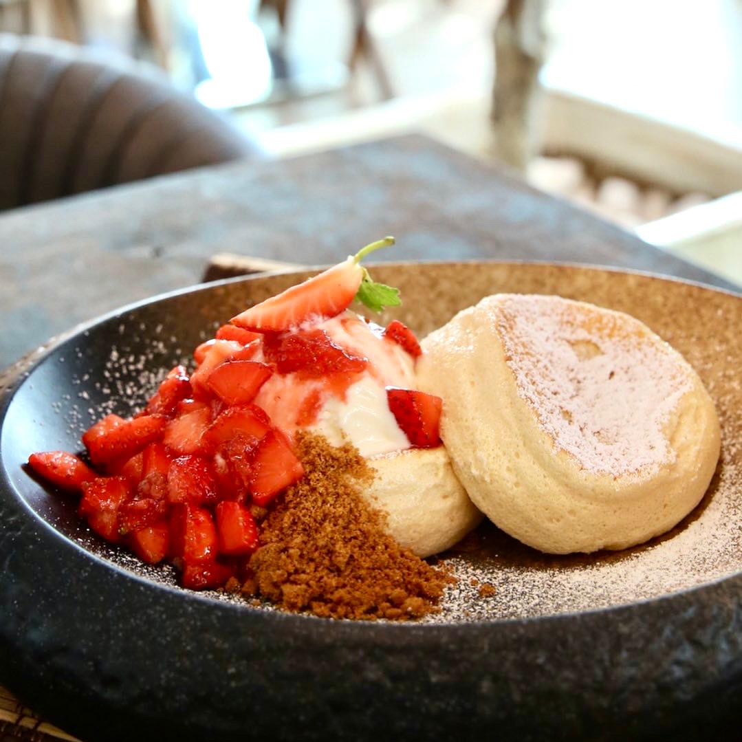 The original Japanese souffle pancake served with cheesy cream and strawberry blend and biscuit on the side.